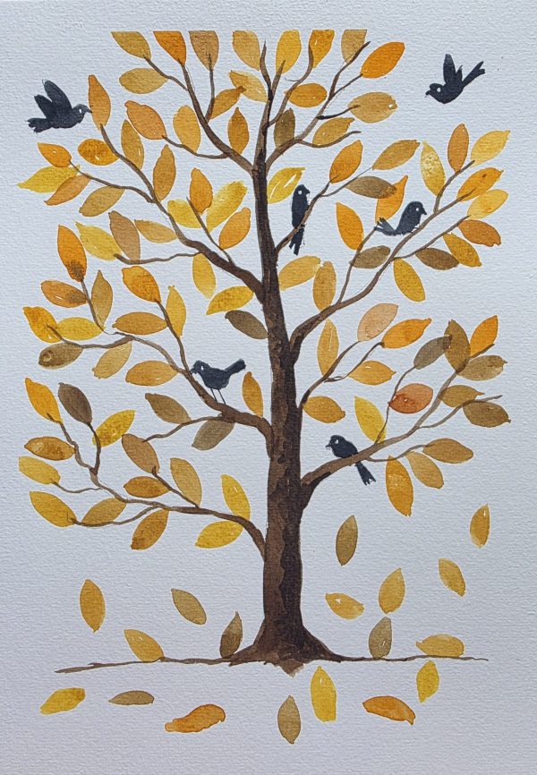 A little whimsical flock of blackbirds are perched in this tree. The leaves are turning to shades of orange gold and brown and are beginning to fall.