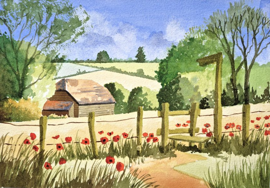 The centuries old barn still stands at the farm, surrounded by the gently rolling hills and fields full of crops ripening in the sun. Wild poppies grow along the edges of the fields.