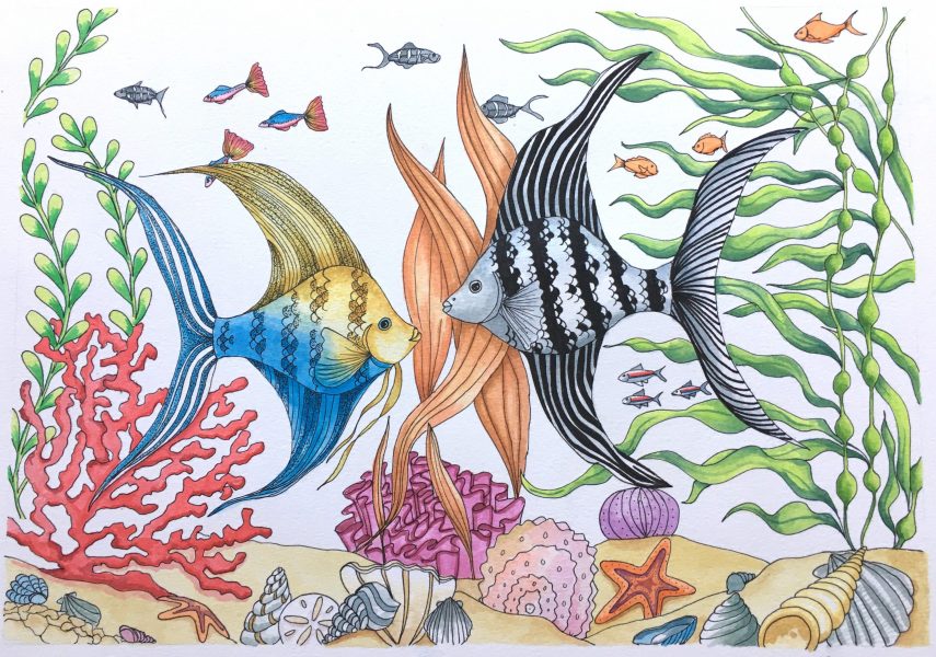 i used to keep tropical fish (and a tricky business it is too) and have had one or two angel fish in my time. I cannot claim that these are exact representations, but hey certainly remind me of those particular fishes. There are also some guppies and neon tetras floating about there too.