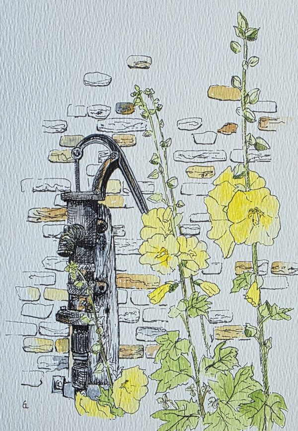 A relic from a bygone age I spotted this water pump amongst the hollyhocks at a stately home we were visiting. The very old bricks were full of texture and colour and were a great foil for the acid yellow flowers.
