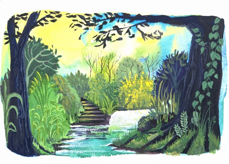 A stream tumbles over a small weir in amongst the trees, flowers and foliage of the secret garden.