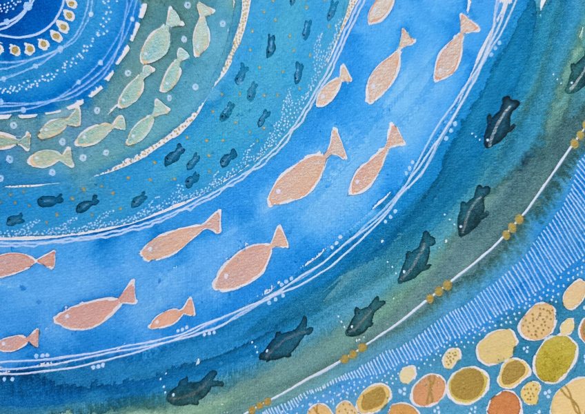 Featuring iridescent paint and illustrative details this is one piece from a series of whirlpool paintings.